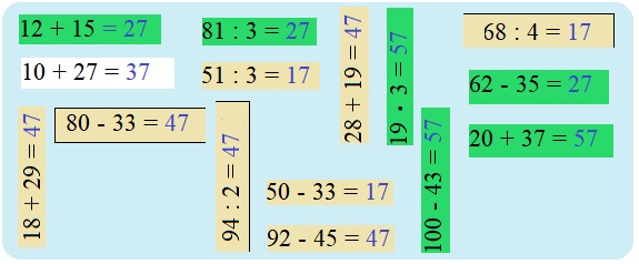 Корабль с жёлтыми парусами посетил острова, на которых записаны выражения со значениями 17 и 47, а корабль с зелёными парусами со значениями 27 и 57. Раскрась жёлтым цветом острова, включенные в маршрут первого корабля, а зелёным – в маршрут второго корабля. Найди остров, который не посетит ни один корабль. Замени одно слагаемое в сумме, записанной на нём, чтобы этот остров посетил корабль с жёлтыми парусами, корабль с зелёными парусами.
