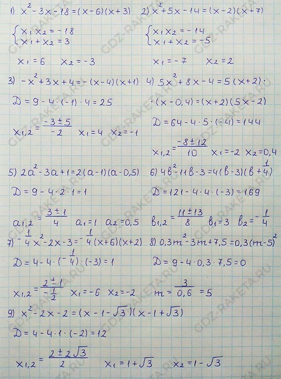 2) x2 + 5x – 14;     5) 2a2 – 3a + 1;     8) 0,3m2 – 3m + 7,5;