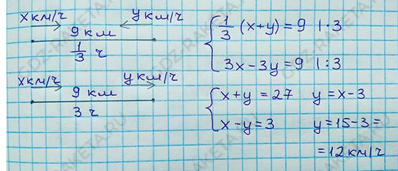 Из двух сёл, расстояние между которыми 9 км, одновременно навстречу друг другу выехали два велосипедиста и встретились через 20 мин. Если бы велосипедисты ехали в одном направлении, то один из них догнал бы другого через 3 ч. Найдите скорость каждого велосипедиста.