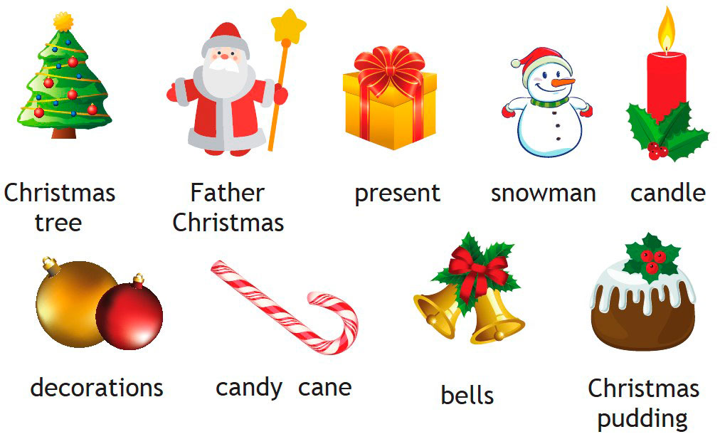 Прочитай слова, связанные с Рождеством и Новым годом.