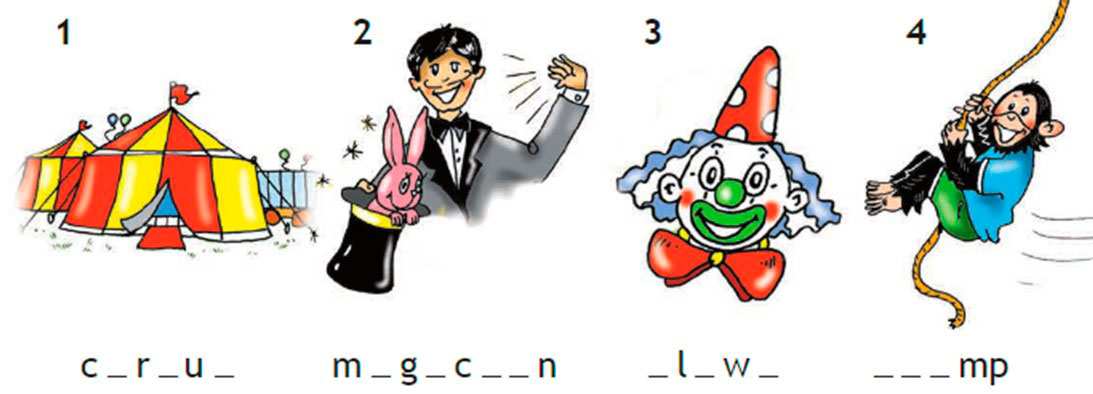 1. Цирк, 2. Фокусник, 3. Клоун, 4. Шимпанзе