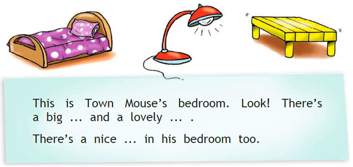 This is Town Mouse's bedroom. Look! There's a big bed and a lovely lamp.