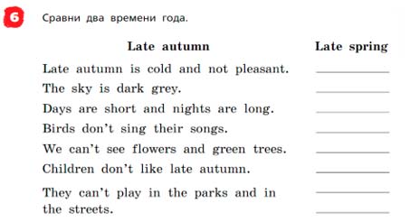 What do you like to do in this season? Что ты любишь делать в это вемя года? - I like to swim and meet with friends in summer. Мне нравится плавать и встречаться с друзьями летом.