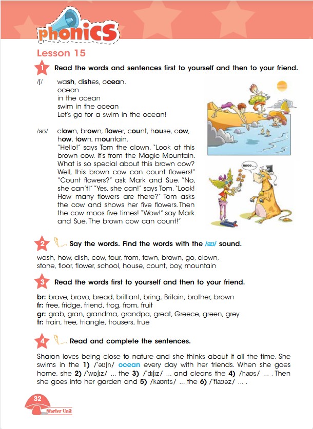 Sharon loves being close to nature and she thinks about it all the time. She swims in the 1) /'əʊʃn/ ocean every day with her friends. When she goes home, she 2) /'wɒʃız/ ... the 3) /'dıʃız/ ... and cleans the 4) /haʊs/ ... . Then she goes into her garden and 5) /kaʊnts/ ... the 6) /'flaʊəz/ ... .