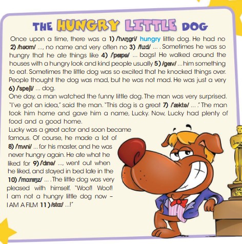 Lucky was a great actor and soon became famous. Of course, he made a lot of 8) money for his master, and he was never hungry again. He ate what he liked for 9) dinner, went out when he liked, and stayed in bed late in the 10) mornings. The little dog was pleased with himself. “Woof! Woof! I am not a hungry little dog now – I AM A FILM 11) STAR!”