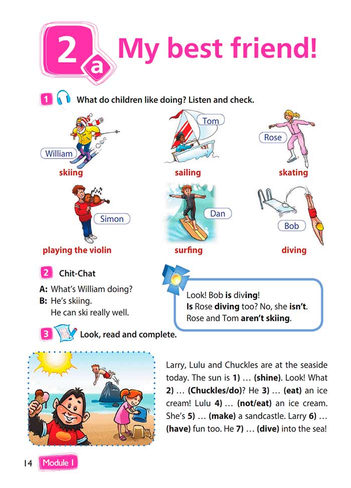 Larry, Lulu and Chuckles are at the seaside today. The sun is 1) ... (shine). Look! What