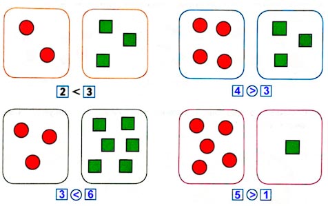 Сравни количество фигур в группах каждой пары. Востанови пропуски в записях, как показано на образце.