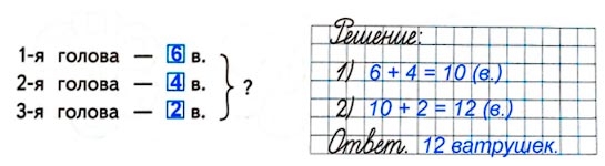 1) Одна голова Змея Горыныча съела 6 ватрушек, вторая – 4 ватрушки, а третья – 2 ватрушки. Сколько всего ватрушек съели все три головы Змея Горыныча?