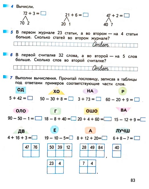 Выполни вычисления. Прочитай пословицу, записав в таблицы под ответами примеров соответствующие части слов.