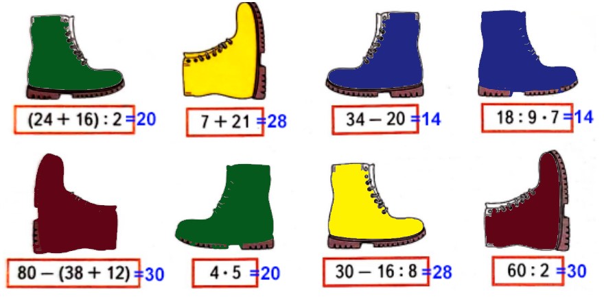 Каждому ботинку найди пару так, чтобы значения выражений на этих ботинках были равны. Раскрась ботинки так, чтобы каждая пара была одного цвета.