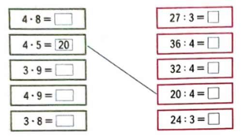 Для каждого произведения найди частное-проверку. Соедини соответствующие выражения, как показано в образце. Выполни вычисления.