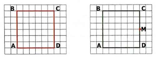 На рисунке слева из вершины А проведи отрезок так, чтобы он разделил квадрат ABCD на 2 равных треугольника, а на рисунке справа из точки М проведи отрезок так, чтобы он разбил квадрат на 2 равных прямоугольника.