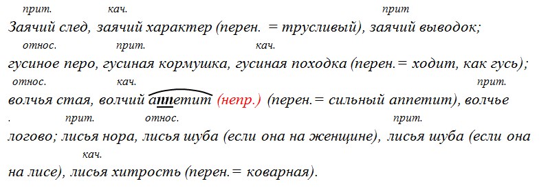 Заячий след, заячий характер, заячий выводок; гусиное перо, гусиная кормушка, гусиная походка; волчья стая, волчий а(п, пп)етит, волчье логово; лисья нора, лисья шуба, лисья хитрость.